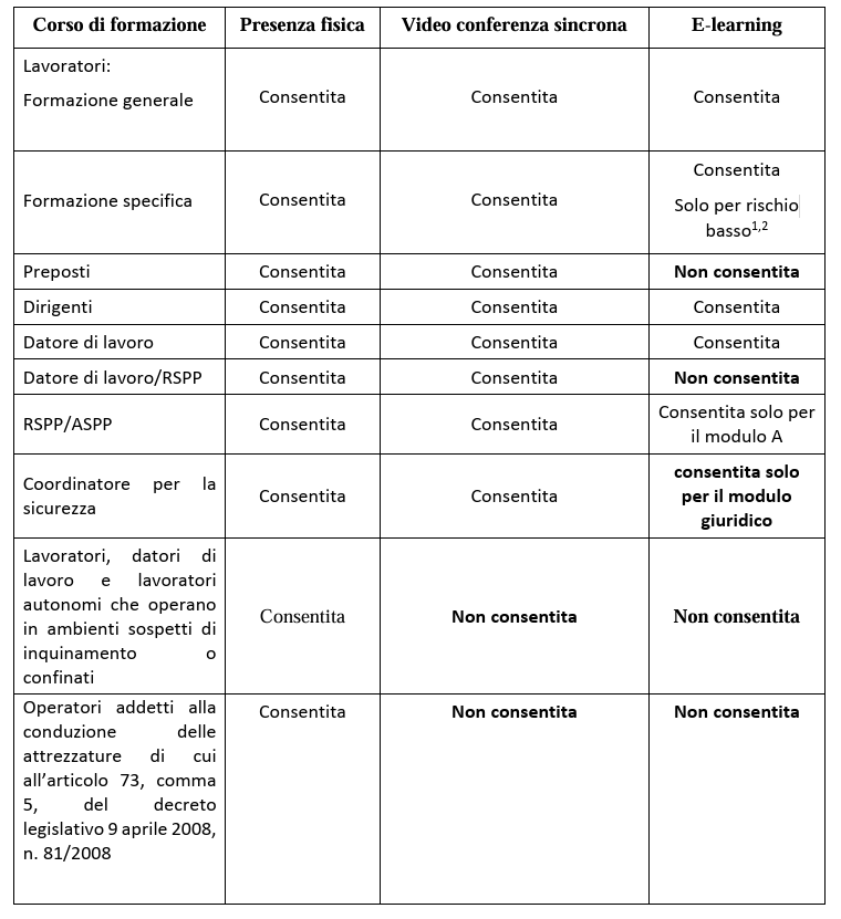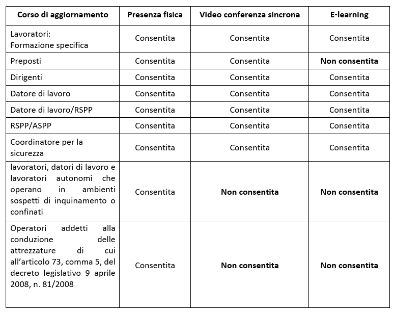 Di seguito, due tabelle riassuntive5 – rispettivamente del corso di formazione e di aggiornamento – delle modalità di erogazione usufruibili o meno per ogni categoria.